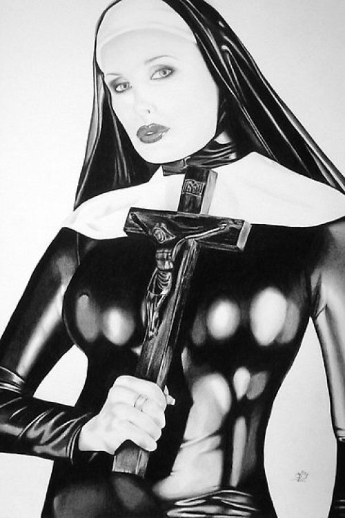 Her hair`s razored into a sleek black bob, her curves are perfectly encased in a tight black corset, and her 6in stilettos look like weapons of torture.